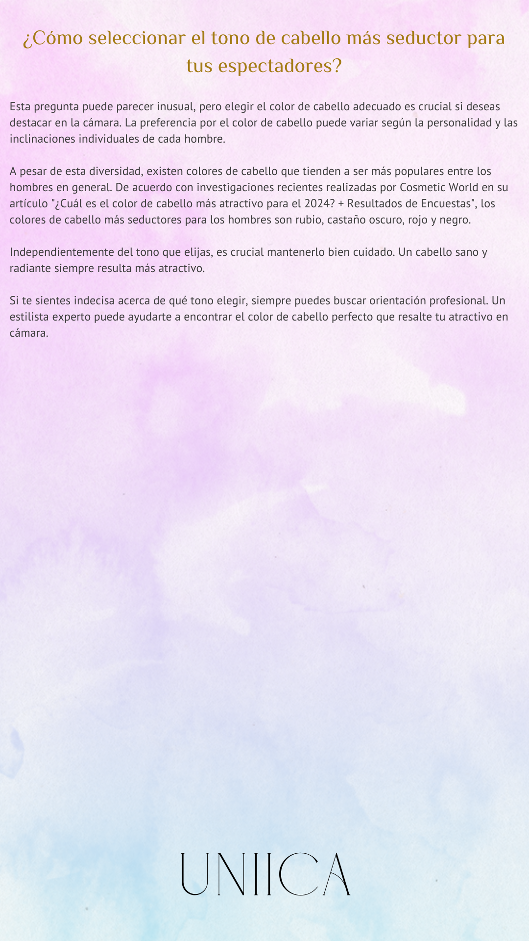 ¿Cómo seleccionar el tono de cabello más seductor para tus espectadores? / Blog / Por Uniica Esta pregunta puede parecer inusual, pero elegir el color de cabello adecuado es crucial si deseas destacar en la cámara.