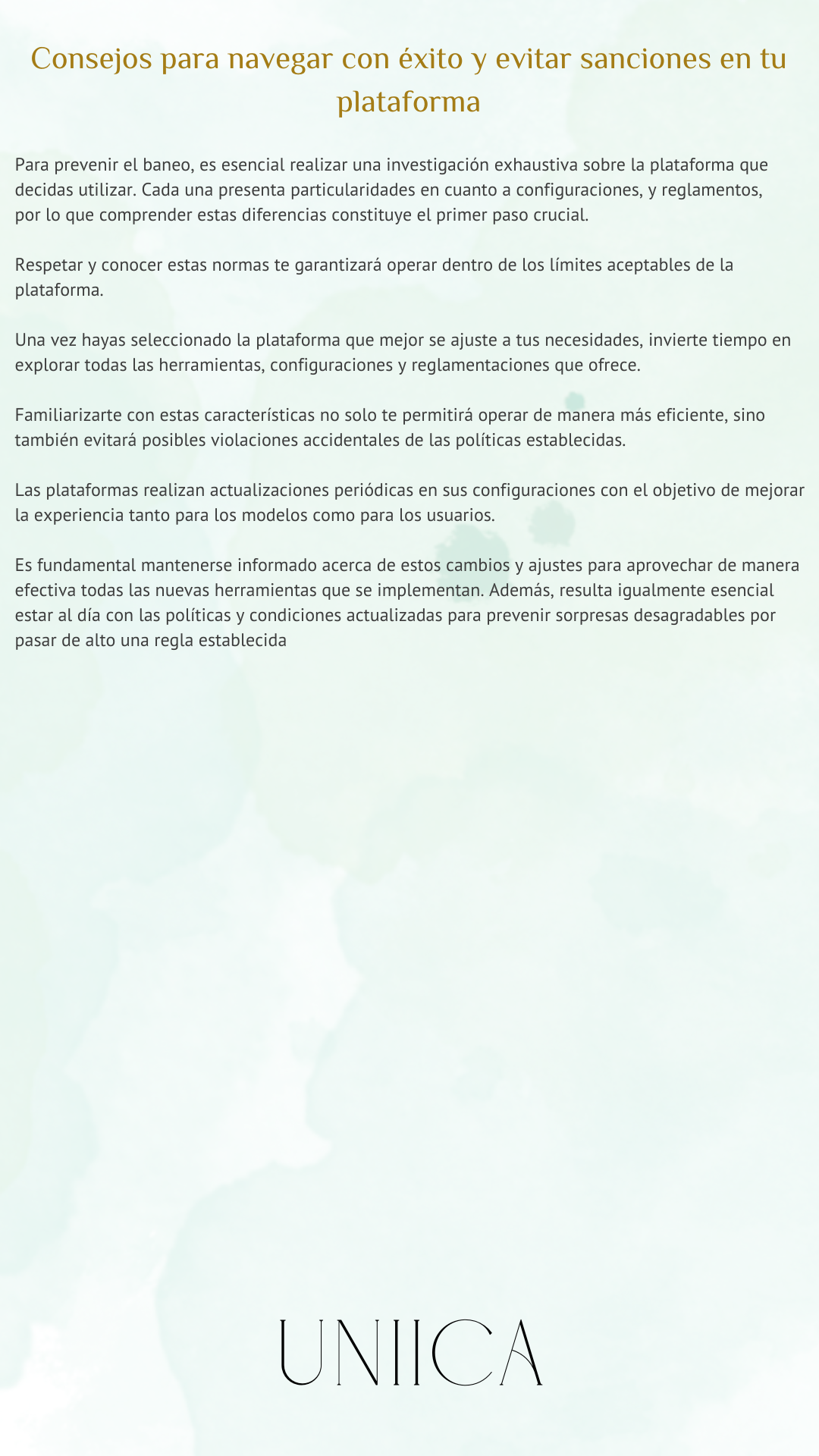 Consejos para navegar con éxito y evitar sanciones en tu plataforma / Blog / Por Uniica Para prevenir el baneo, es esencial realizar una investigación exhaustiva sobre la plataforma